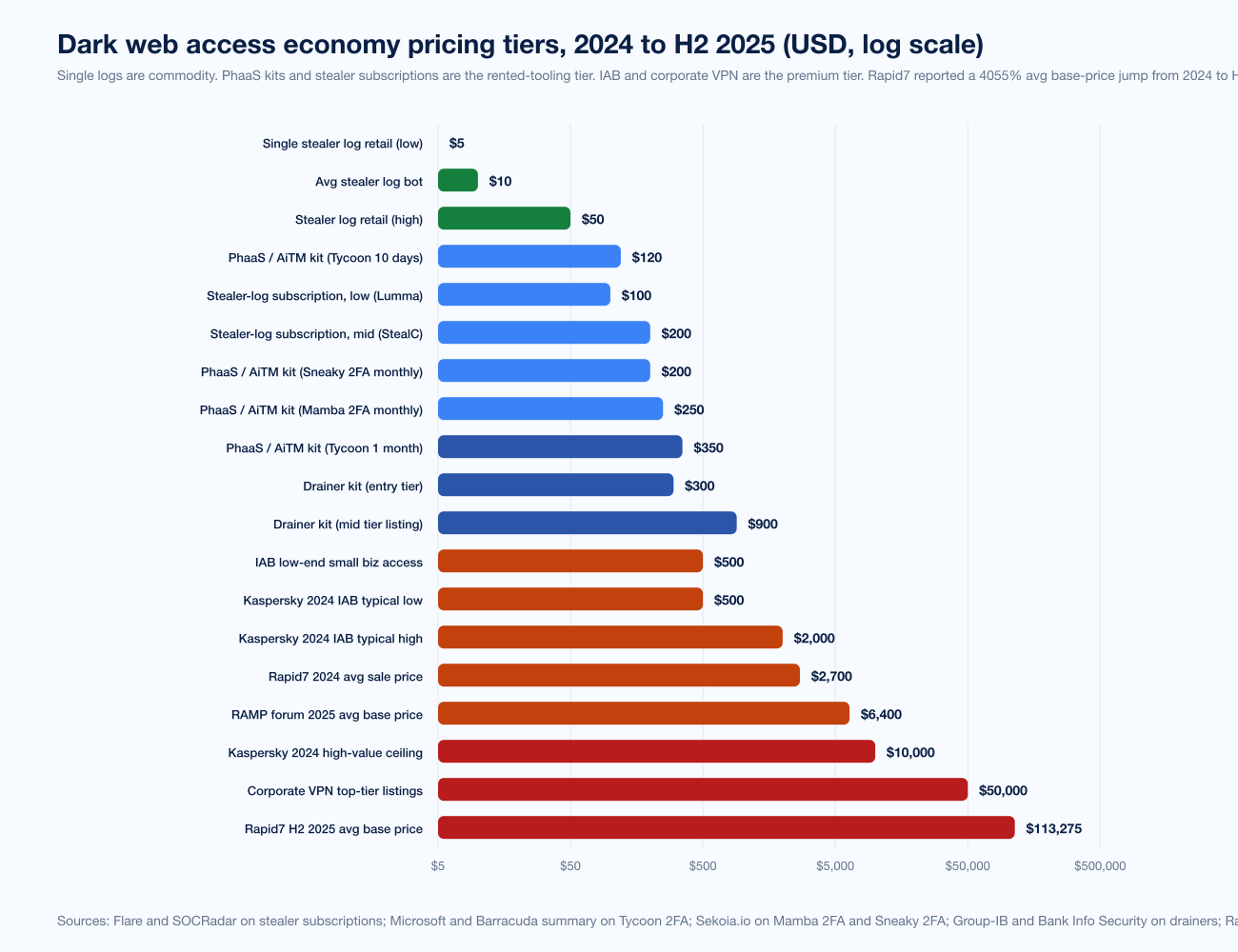 Rapid7's 2025 IAB Report, tracking full-year 2024 listings, measured the average sale price at just over US$2,700, with nearly 40% of offerings priced US$500 to US$1,000 and 71% offering privileged access. The Rapid7 H2 2025 update measured the average base price at US$113,275 (an approximate 4055% YoY jump) driven by forum migration toward DarkForums and RAMP after the BreachForums collapse. Kaspersky Securelist's 2024 baseline put most listings in the US$500 to US$2,000 band, with high-value listings exceeding US$10,000.