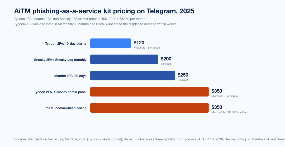 Tycoon 2FA was priced at US$120 for a 10-day starter and US$350 for a 1-month admin panel on Telegram before its March 4, 2026 disruption by Microsoft, Europol, and a private-sector coalition. The kit reached over 500,000 organizations per month at peak and accounted for approximately 62% of phishing attempts Microsoft blocked. After disruption, Mamba 2FA at US$250 per month and Sneaky 2FA at US$200 per month absorbed displaced demand.