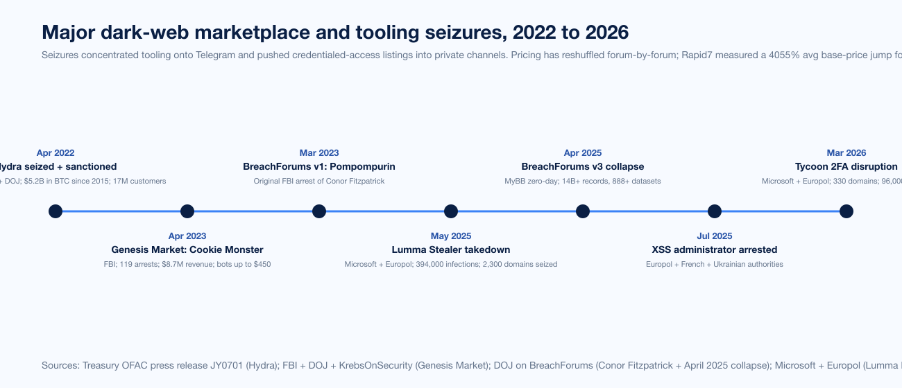 Marketplace seizures concentrated activity, not supply. Treasury OFAC's April 2022 Hydra sanction took US$5.2B in cumulative BTC offline; Operation Cookie Monster in April 2023 produced 119 arrests on Genesis Market; BreachForums collapsed across multiple 2024-2025 sequences with US DOJ filings citing 888+ datasets and 14B+ records; XSS lost its administrator in July 2025; the Tycoon 2FA disruption in March 2026 seized 330 domains. After every shutdown, listings reappeared on DarkForums or moved to private Telegram channels within weeks; pricing reshuffled forum by forum, but the volume held.
