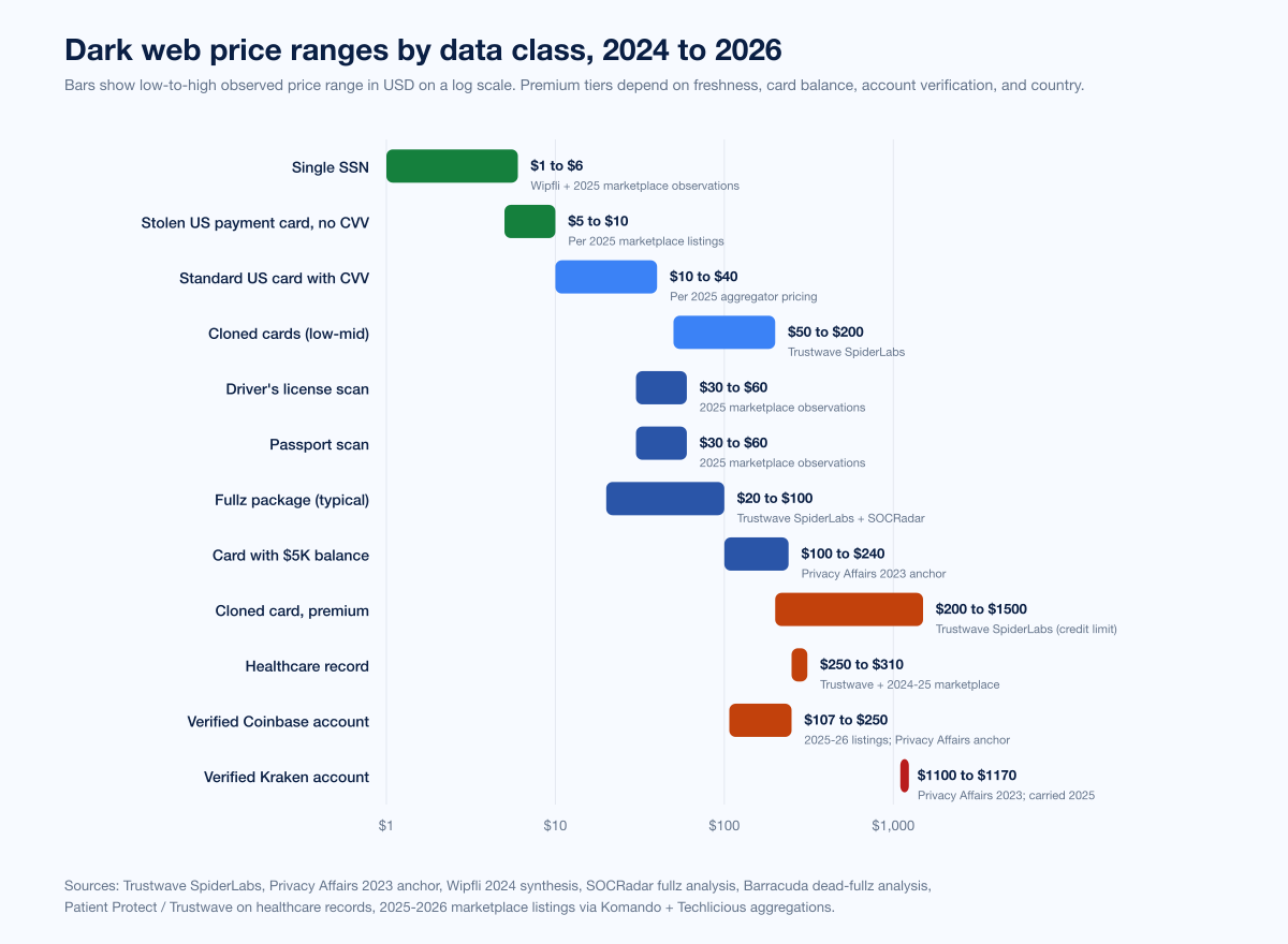 Figure 1: Dark web price ranges by data class on a log scale, 2024 to 2026. Single SSN US$1 to US$6, stolen US payment card no CVV US$5 to US$10, standard US card with CVV US$10 to US$40, fullz package US$20 to US$100, drivers license scan US$30 to US$60, passport scan US$30 to US$60, card with US$5K balance US$100 to US$240, cloned card premium US$200 to US$1,500, healthcare record US$250 to US$310, verified Coinbase account US$107 to US$250, verified Kraken account US$1,100 to US$1,170. Sources: Trustwave SpiderLabs; Privacy Affairs 2023 anchor; Wipfli 2024 synthesis; SOCRadar fullz analysis; Barracuda on dead fullz; Patient Protect on healthcare records.