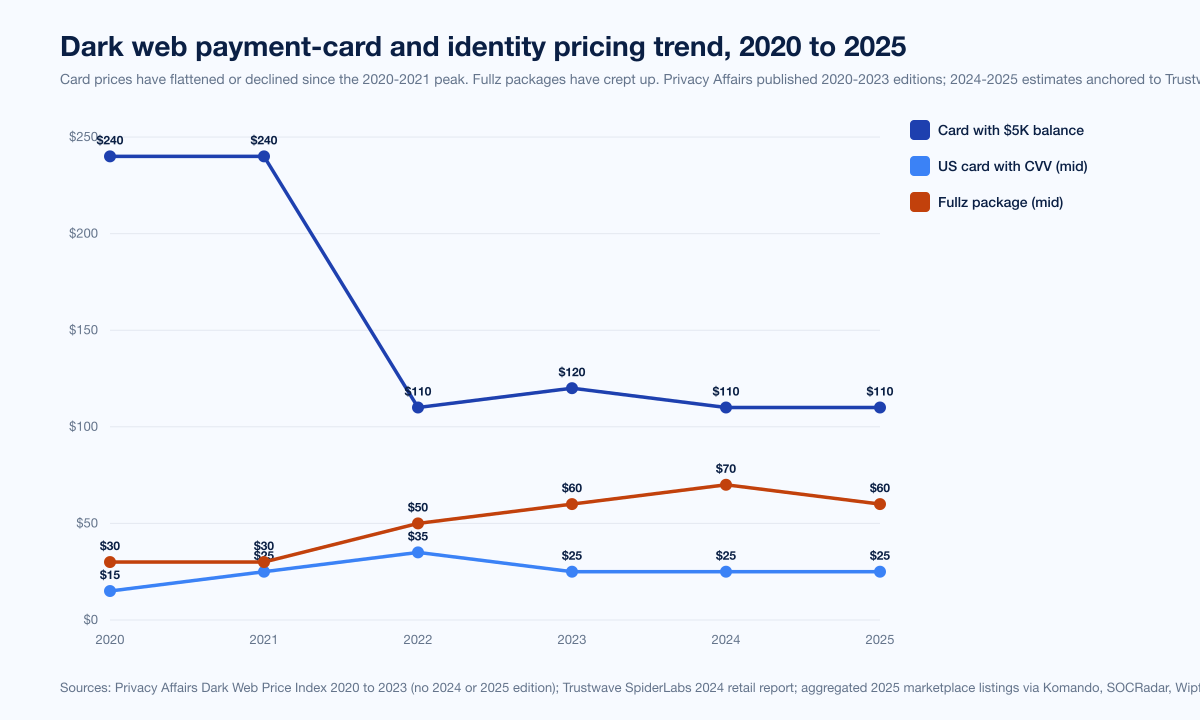 The retail price of common stolen data has stayed cheap or fallen since 2020 because supply has scaled faster than demand. Privacy Affairs's last-published Dark Web Price Index 2023 put a credit card with a US$5,000 balance at US$120, where it had been close to US$240 in the 2020-2021 editions; Trustwave SpiderLabs's 2024 retail-sector synthesis measured fullz at US$20 to US$100 and cloned cards at US$50 to US$1,500. Single SSNs sit around US$1 to US$6 in 2025 marketplace listings. The economics shifted from "selling cards" to "selling access."