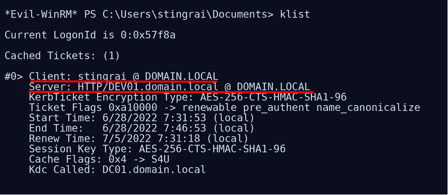 Alternatively, you log in through RDP to DEV01 with the same account. Now klist starts to show a much more complete Kerberos context, including a primary TGT. The same domain query that failed in the WinRM session starts working normally.