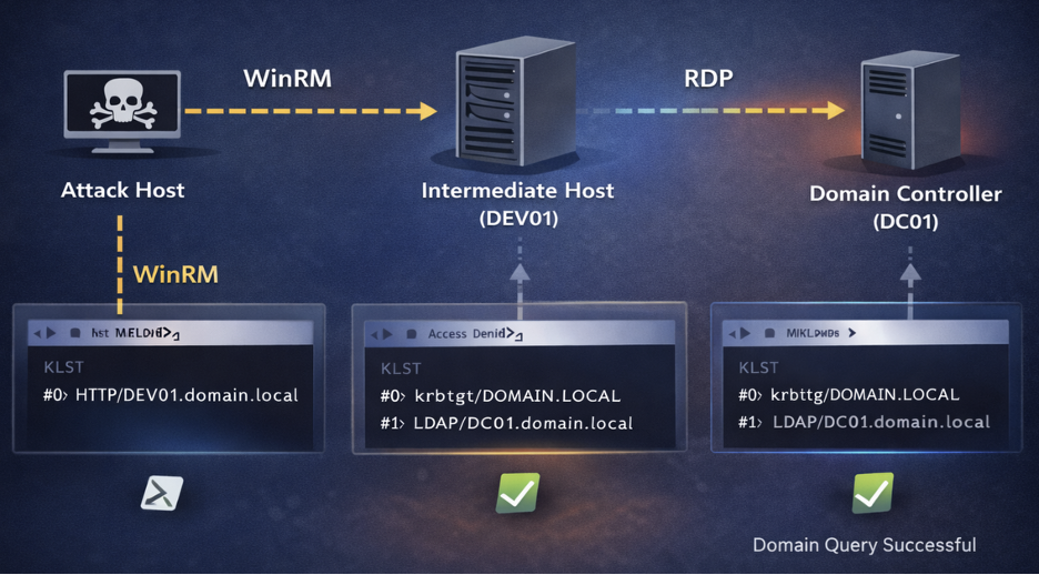 WinRM is often framed, but in practice it is only the scenario where the “problem” appears most clearly. When you connect through WinRM to a domain host, the default flow tends to use Kerberos. The ticket presented to the remote host is normally a TGS for the HTTP service of that host, something like: HTTP/dev01.domain.local
