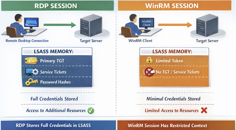 A natural question is: if WinRM breaks, why is the situation usually different when using RDP to the same host? A practical way to understand the problem is to observe what is stored in LSASS depending on the authentication type and the logon type.