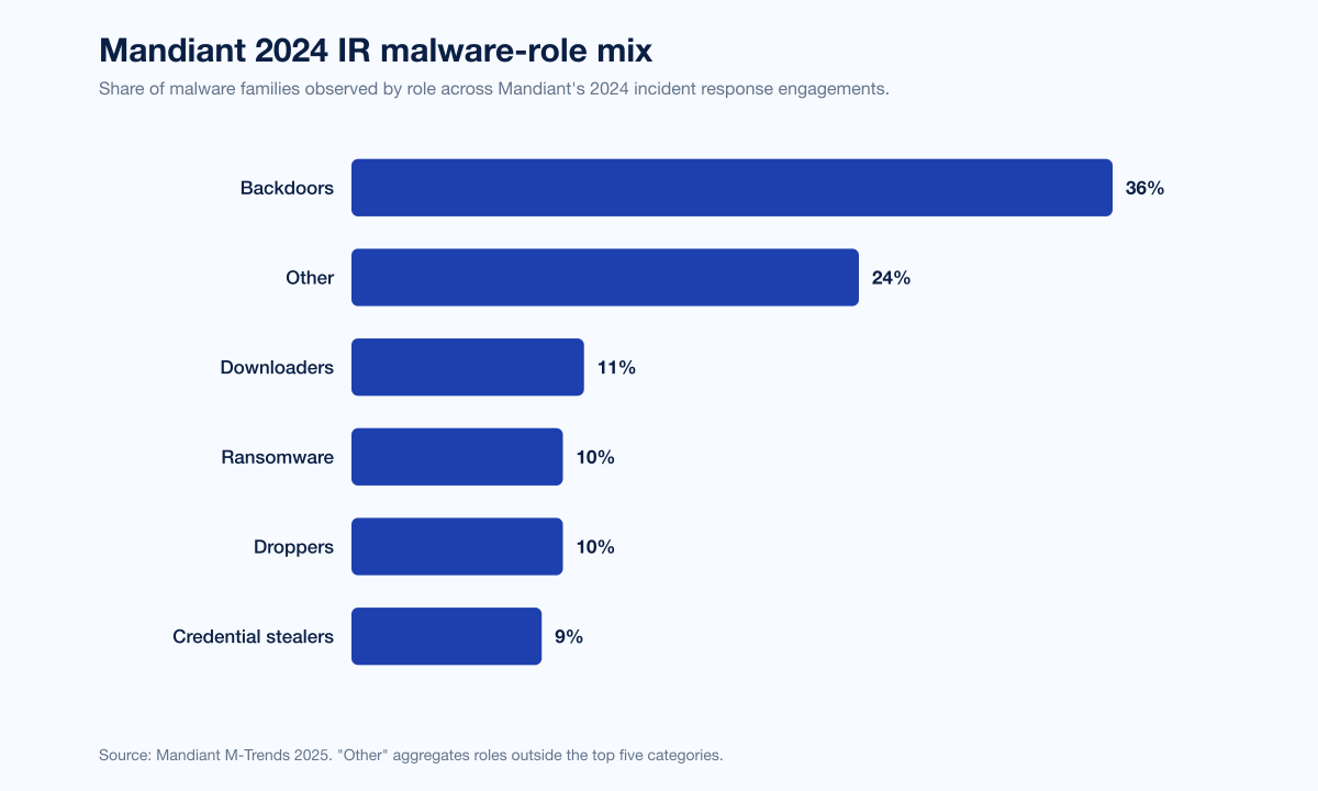 Figure 2: Share of malware families observed in Mandiant 2024 IR investigations by role. Backdoors dominate at 36%, ahead of downloaders (11%), ransomware (10%), droppers (10%), and credential stealers (9%). Source: Mandiant M-Trends 2025.