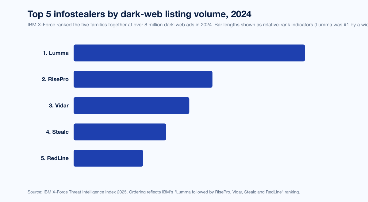 IBM X-Force 2024 top-5 infostealers (by dark-web listing volume): Lumma, RisePro, Vidar, Stealc, RedLine; top-5 group together produced more than 8 million ads (IBM X-Force Threat Intelligence Index 2025).