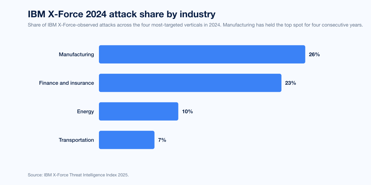 IBM X-Force ranked 2024 attack share by industry as manufacturing 26%, finance and insurance 23%, energy 10%, and transportation 7%. Manufacturing has held the top spot for four consecutive years. In manufacturing specifically, 40% of attacks involved data theft targeting financial assets and intellectual property. Verizon's 2025 DBIR saw espionage-motivated breaches in manufacturing rise from 3% to 20% YoY and ransomware attacks against manufacturing grow 61%. Mandiant's M-Trends 2025 ranks the most-targeted IR-engagement industries differently: financial 17.4%, business and professional services 11.1%, high tech 10.6%, government 9.5%, healthcare 9.3%.