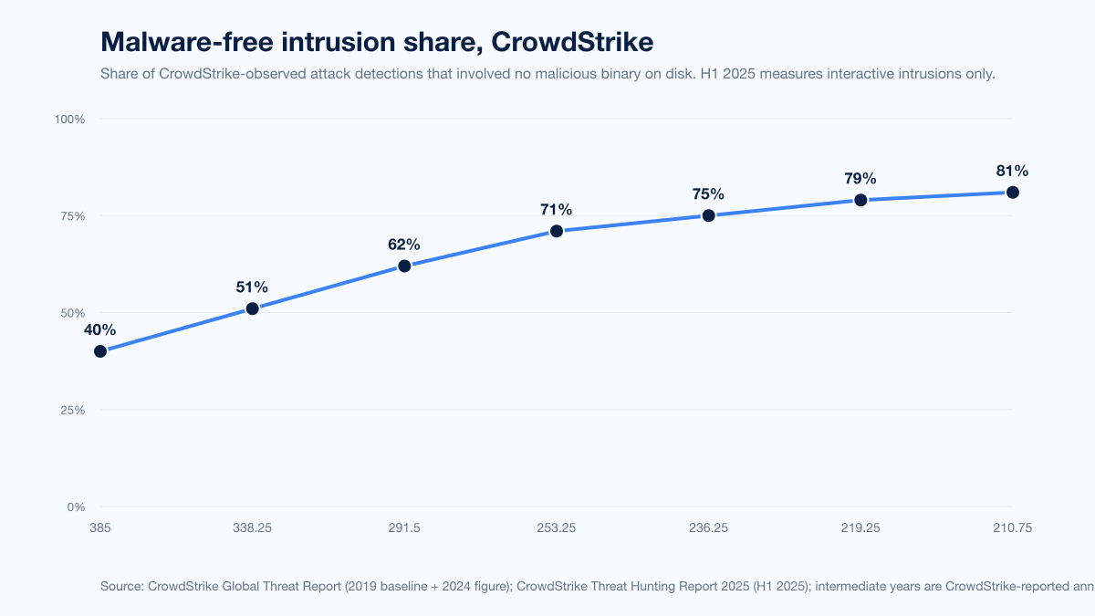 CrowdStrike's 2025 Global Threat Report, released in February 2025, found 79% of all attack detections in 2024 were malware-free. That share has climbed steadily from 40% in 2019. The 2025 Threat Hunting Report, released in August 2025 and based on H1 2025 OverWatch hunt telemetry, put the malware-free share of interactive intrusions at 81%. eCrime activity made up 73% of all interactive intrusions in the same period.