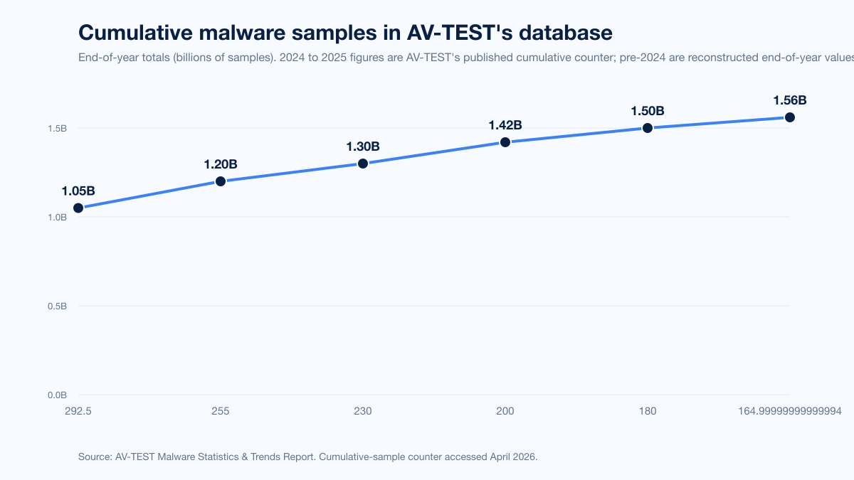 The malware threat surface in 2026 is a paradox. AV-TEST has indexed more than 1.56 billion unique malware samples and registers another 450,000 to 560,000 new ones every single day. Yet CrowdStrike's 2025 Global Threat Report found 79% of attack detections in 2024 involved no malware at all, climbing to 81% of interactive intrusions in the first half of 2025. Adversaries are signing in with stolen credentials, abusing valid sessions, and living off the land while vendor labs collect record sample counts.