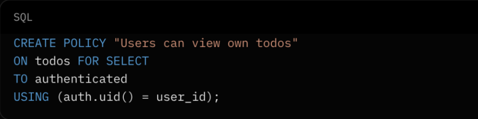 Define policies that control who can access each row. Example: Only allow authenticated users to read their own data: