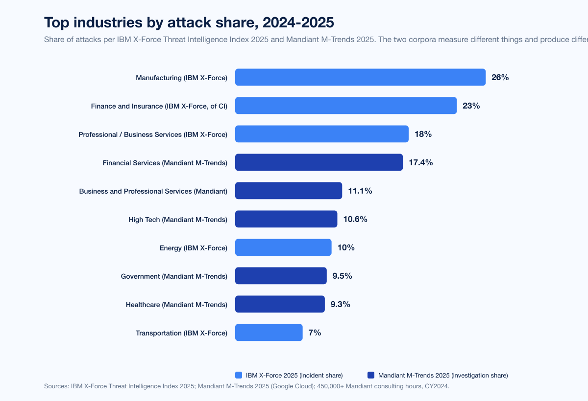 Figure 1: Top industries by attack share in 2024-2025 across two primary publishers. IBM X-Force Threat Intelligence Index 2025 ranks Manufacturing 26%, Finance and Insurance 23%, Professional/Business/Consumer Services 18%, Energy 10%, Transportation 7%. Mandiant M-Trends 2025 ranks Financial Services 17.4%, Business and Professional Services 11.1%, High Tech 10.6%, Government 9.5%, Healthcare 9.3%. Sources: IBM X-Force Threat Intelligence Index 2025; Mandiant M-Trends 2025.