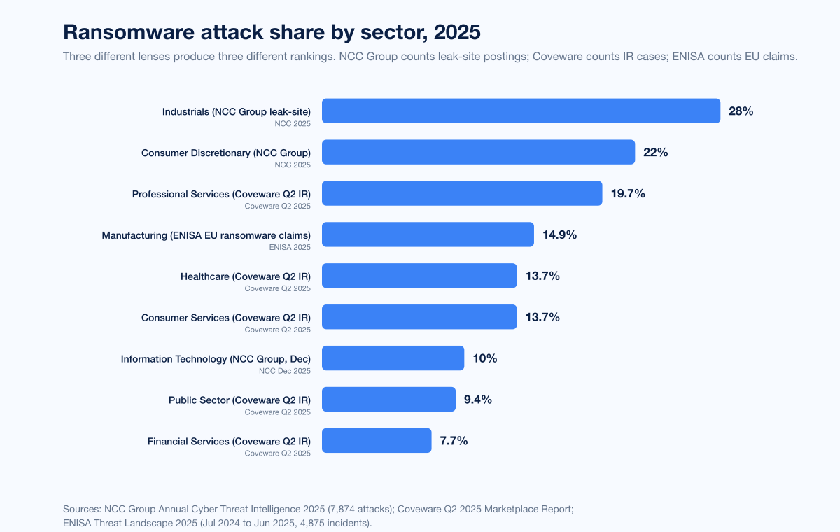 Three primary publishers give three different but compatible answers. NCC Group 2025 (leak-site activity, 7,874 attacks): Industrials 28%, Consumer Discretionary 22%, IT 10%. Coveware Q2 2025 (incident-response caseload): Professional Services 19.7%, Consumer Services 13.7%, Healthcare 13.7%, Public Sector 9.4%, Financial Services 7.7%. Cisco Talos 2025: Manufacturing #1 ransomware target, Higher Education #1 device-compromise target. The combination of leak-site, IR caseload, and per-vendor telemetry shows that Industrials/Manufacturing leads visible ransomware events while Professional Services has emerged as the top IR caseload sector in 2025.