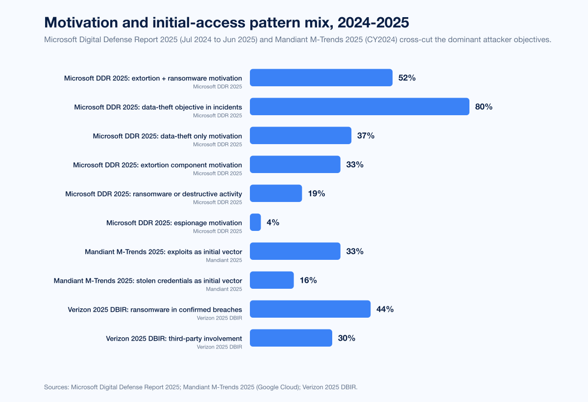 Figure 5: Motivation and pattern mix per Microsoft Digital Defense Report 2025 and Mandiant M-Trends 2025. Microsoft (Jul 2024 to Jun 2025): 52% extortion/ransomware, 4% espionage, 80% data-theft objective, 37% data-theft only, 33% extortion component, 19% ransomware/destructive. Mandiant (CY2024) initial vectors: exploits 33%, stolen credentials 16%. Sources: Microsoft Digital Defense Report 2025; Mandiant M-Trends 2025.