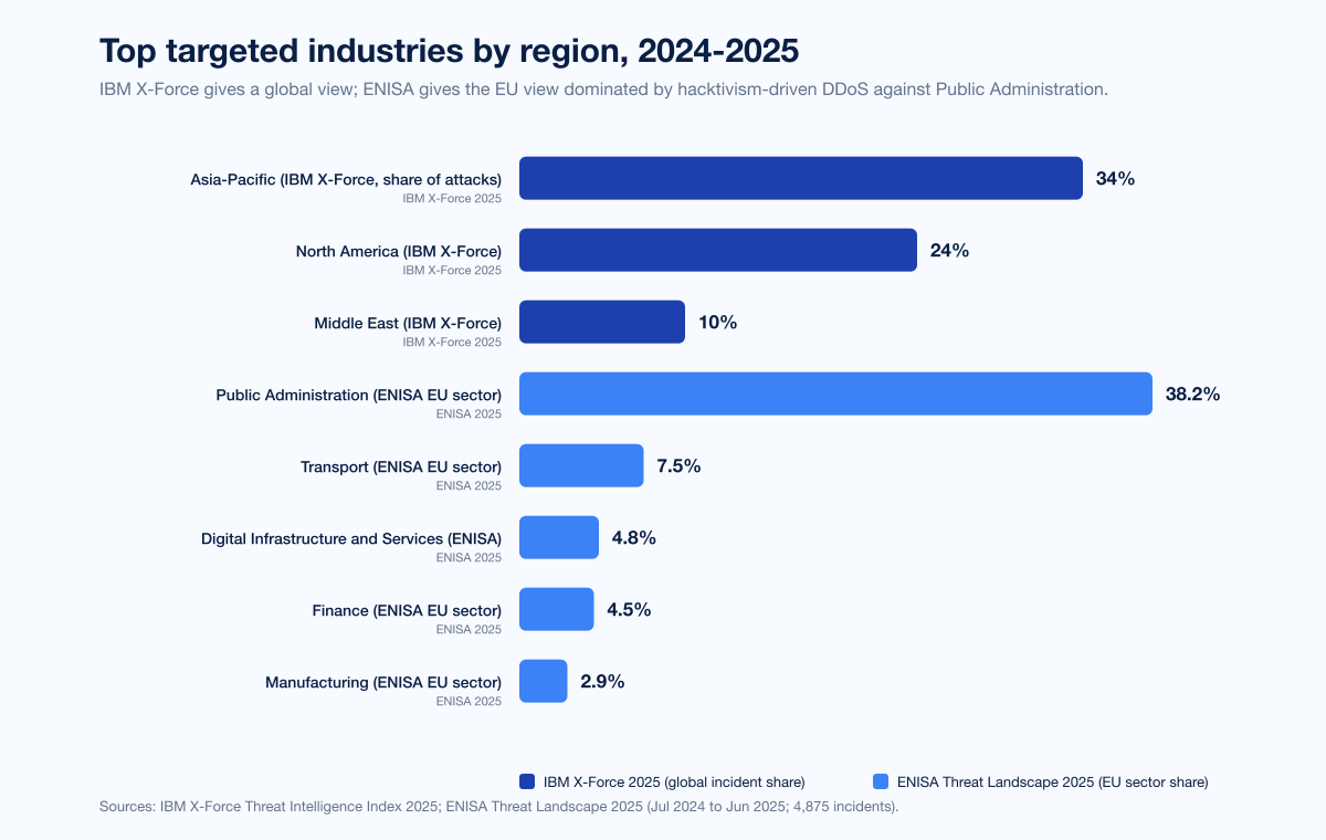 IBM X-Force 2025 lists Asia-Pacific at 34% of attacks (most-targeted region), North America at 24%, Europe third, and Middle East at 10% (up from 7% in 2023). Inside Europe, ENISA's Threat Landscape 2025 reports a different picture because of hacktivism-driven low-impact DDoS: Public Administration 38.2%, Transport 7.5%, Digital Infrastructure 4.8%, Finance 4.5%, Manufacturing 2.9%. The transatlantic difference is largely a hacktivism artifact; outside Europe, financially-motivated criminal activity dominates and Manufacturing and Finance rise to the top.