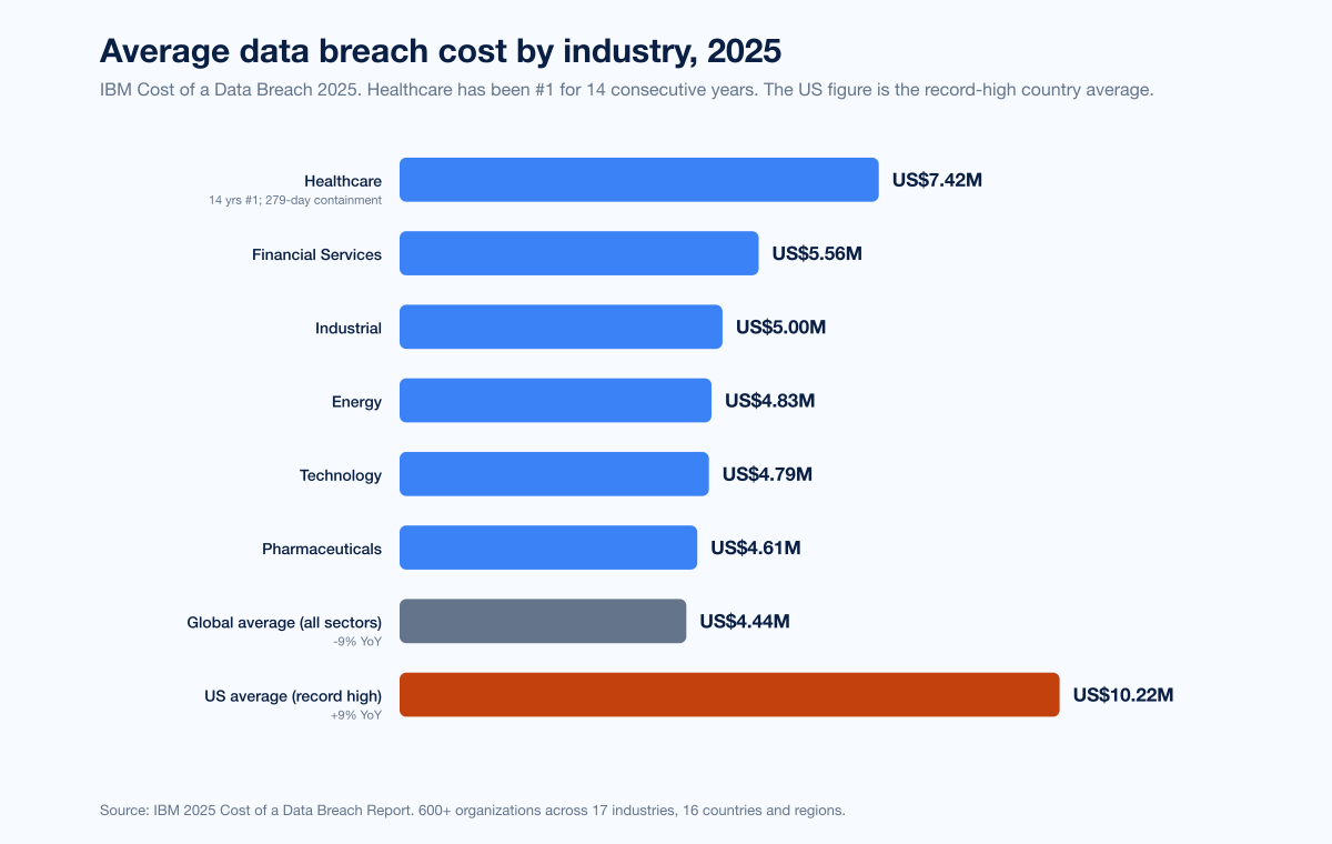 Highest breach cost (IBM, 2025): Healthcare at US$7.42M, 14 consecutive years as #1, 279-day containment time (IBM Cost of a Data Breach 2025).