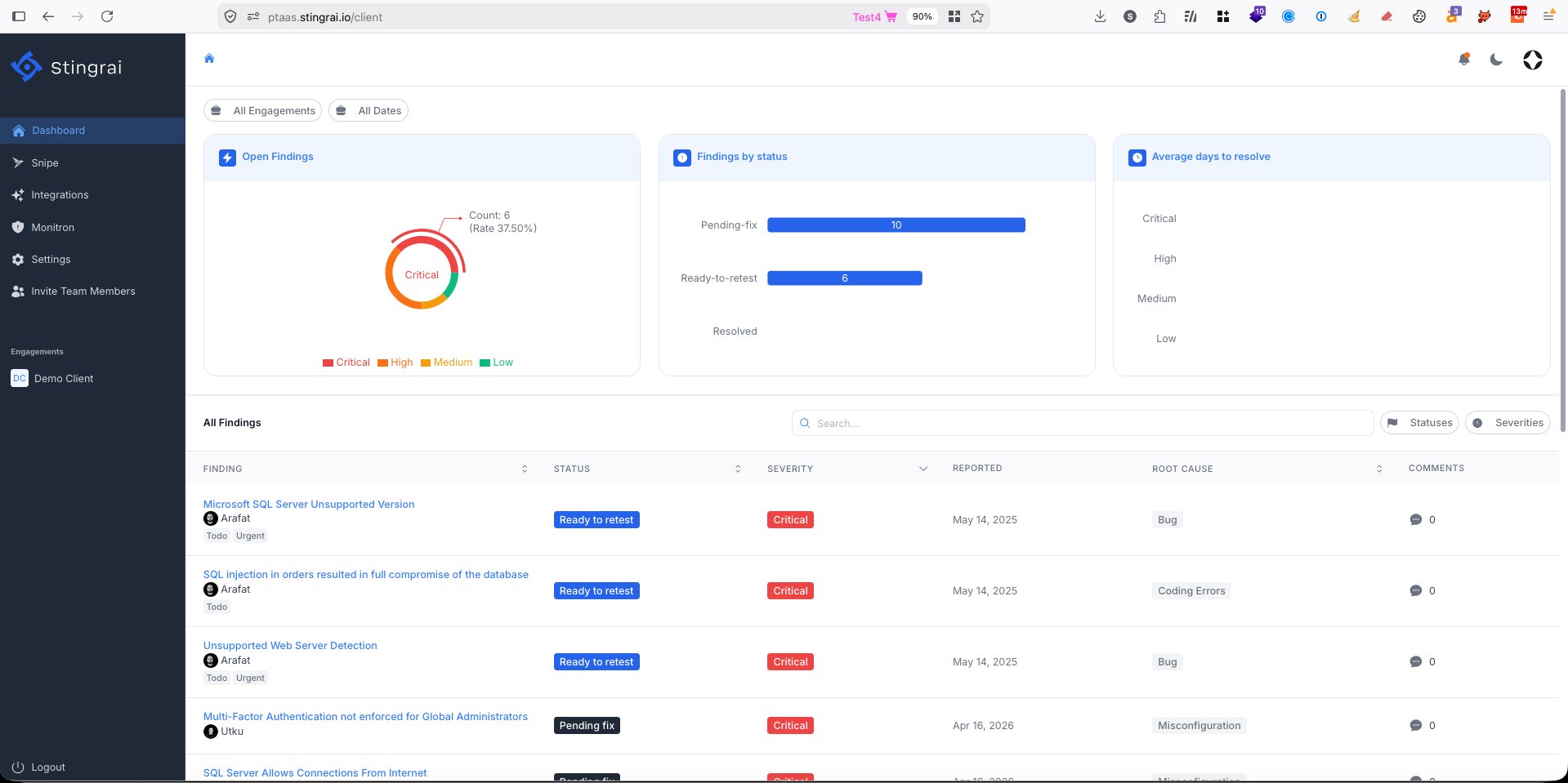 The differentiator is not only talent. It is delivery. Findings stream live into clients' Jira, GitHub, Linear, Slack, and Microsoft Teams through the Stingrai PTaaS platform, so engineering teams can triage and remediate the day a vulnerability is identified instead of three weeks after a PDF arrives by email. Clients retain unlimited support calls during remediation, automated retests verify fixes, and every finding reported through the platform is manually validated by a human pentester.
