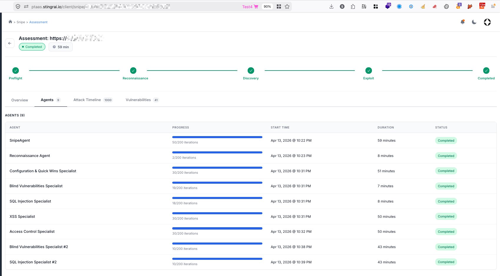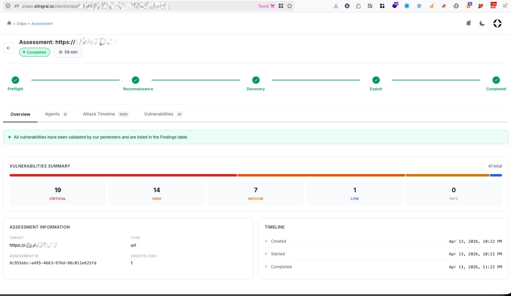 Snipe engagements follow a five phase progression (Preflight, Reconnaissance, Discovery, Exploit, Completed) and deliver findings categorized by severity. One recent assessment visible in the Stingrai platform completed in 59 minutes and surfaced 41 vulnerabilities: 19 Critical, 14 High, 7 Medium, and 1 Low, with every finding manually validated by a Stingrai human pentester before it reached the client portal. Snipe identifies advanced vulnerability classes that defeat generic scanners, including IDOR, business logic flaws, and broken access control.