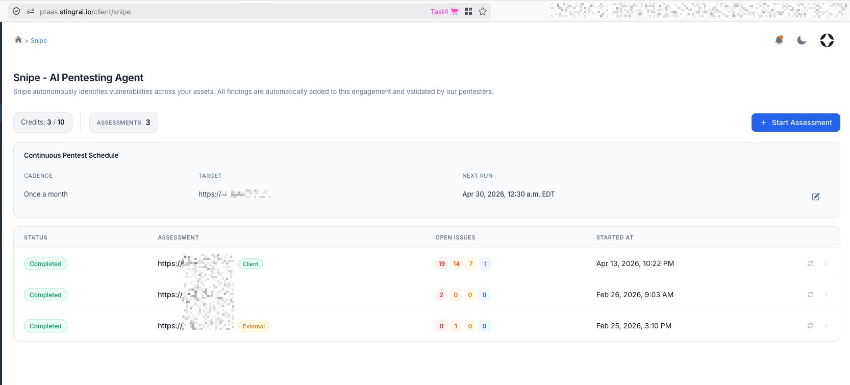 Zero false positives reach the client. Every Snipe finding and every manual finding is validated by a human pentester before it lands in the portal.