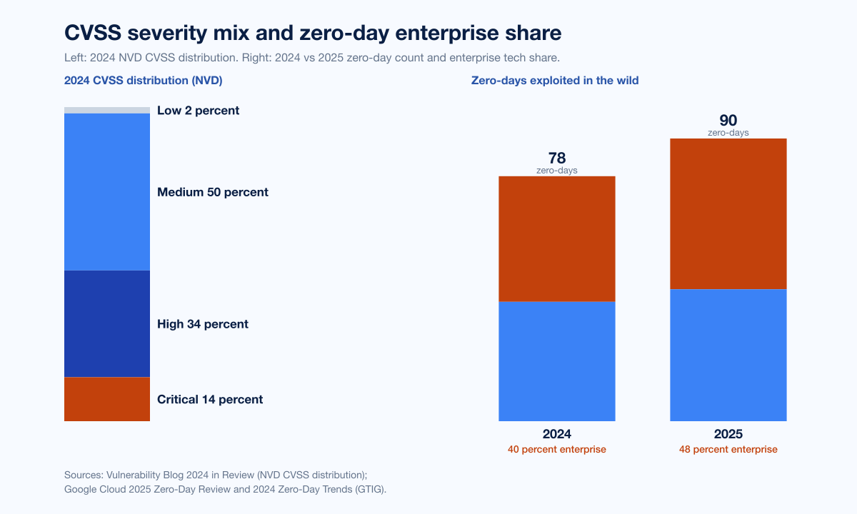 Figure 3: Left: CVSS v3 severity distribution among NVD-reviewed 2024 CVEs. Right: zero-day enterprise vs consumer share, 2024 vs 2025. Sources: Vulnerability Blog 2024 in review; Google Cloud zero-day 2025 review.