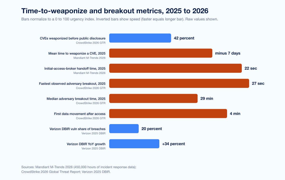 The mean time to exploit was estimated at negative seven days in 2025, meaning exploitation is routinely occurring before a patch is even released. CrowdStrike's 2026 Global Threat Report finds 42 percent of exploited vulnerabilities were attacked before public disclosure, and the initial-access-broker handoff to a ransomware affiliate now averages 22 seconds, per Mandiant M-Trends 2026.