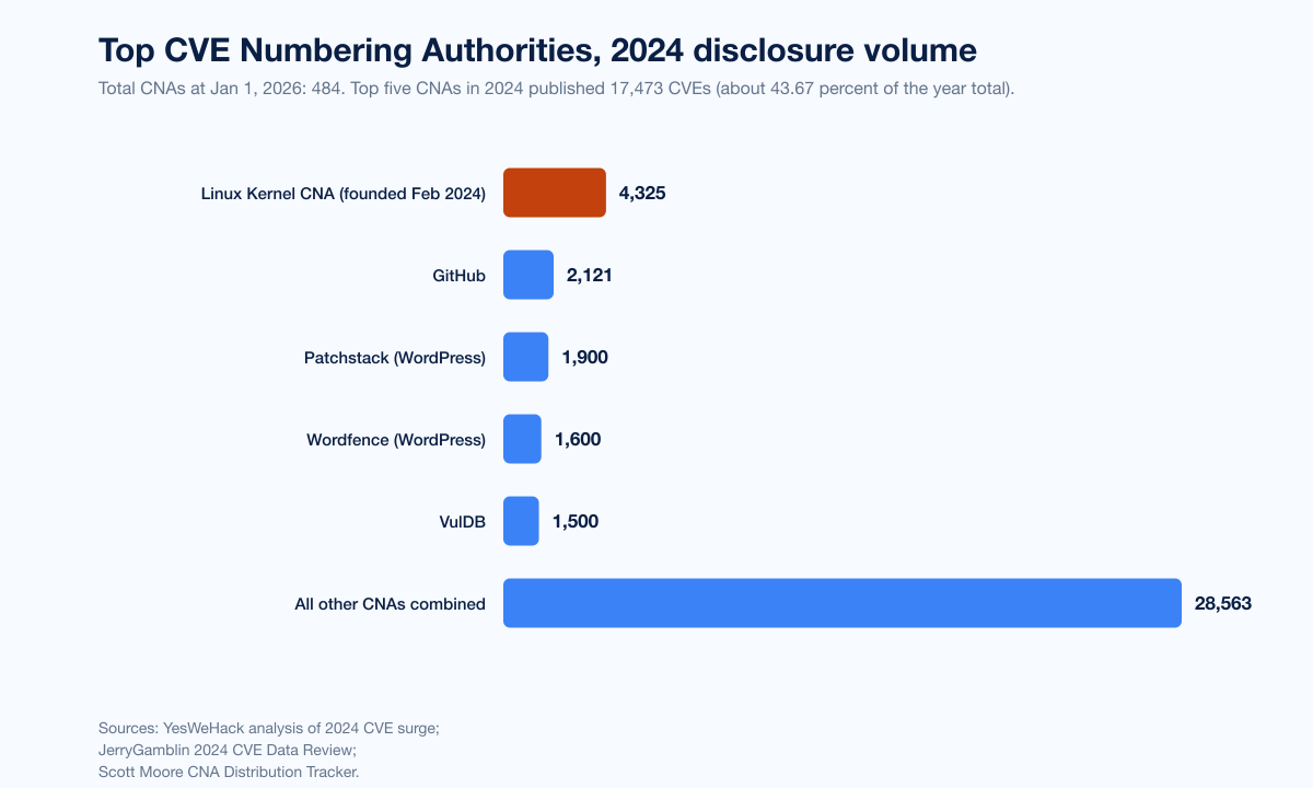 Figure 2: Top CVE Numbering Authorities by 2024 disclosure volume. The Linux Kernel CNA, founded mid-February 2024, immediately became the single largest CNA. Sources: YesWeHack analysis of 2024 CVE surge; JerryGamblin.com 2024 review; Scott Moore CNA Distribution Tracker.