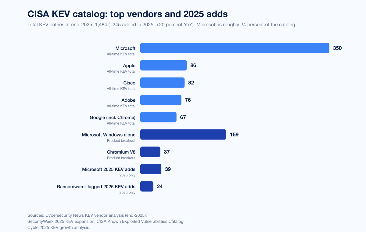 Figure 4: CISA Known Exploited Vulnerabilities catalog distribution by vendor at end of 2025. Microsoft accounts for ~24% of all entries. Sources: Cybersecurity News KEV vendor analysis; SecurityWeek KEV 2025 expansion; CISA KEV catalog.
